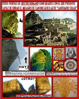 Realmente pudieron ver en el perfil de Tunupa el espíritu de la divinidad solar, al cual los chamanes (pakos) llamaban Apu. Ni que decir tiene que son una legión los que siguen hoy día esforzándose en descubrir los supuestos tesoros de sus antepasados en las grutas y cavidades subterráneas de Ollantaytamboy sus alrededores, siendo especialmente sospechosa la que tiene su entrada bloqueada por un gran corrimiento de tierras en Pacaricampu. Pero el principal tesoro para mi es hacer evidente hasta que punto los antiguos incas sintieron especial aprecio por la forma del rostro, tal como me sucede a mi que lo veo incluso en las panorámicas terrestres dibujado de forma natural. Tengo recogidos cientos de ellos, a pesar de ser sólo montañas geológicas, resultan sorprendentemente exactos en sus pétreas facciones. Como en la mente humana, es cuestión de sintonía.
