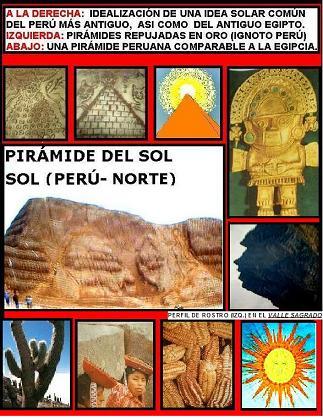 Incluyo fotos de las planchas con muestras de repujados metálicos de pirámides coronadas por el sol, tal como la que yo idealizadamente he situado al lado con un sol encima, ya que fue típica de la cultura egipcia. A poniente de Machu Picchu, en el litoral atlántico, cerca de la población de Ica (famosa por sus grabados en los cantos rodados), en verano del año 2005 se descubrieron vestigios de decenas de pirámides, siendo una de ellas bastante más grande. Desde hace décadas se sabe que en el norte del Perú existe un buen testimonio de que los incas también tuvieron su gran pirámide, pues su magnitud debió de ser comparable a la mayor de la meseta de Giza, una zona que por cierto, también fue motivo de mi mayor atención;... y no por sus pirámides precisamente (Clicar