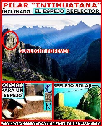 Las terrazas de superpuestas de piedra, que configuran el perfil de un ROSTRO HUMANO en la cima de la cumbre más alta del Machu Picchu, se hicieron para potenciar el efecto reflector del sol, ... que en la ladera de dicha cúspide ya se produciría de forma natural en determinado momento del año de forma natural. Se hicieron para magnificar el natural efecto reflector del sol. Sorprendentemente,en la ladera de dicha cúspide observaron que siempre se veía mucho mejor.